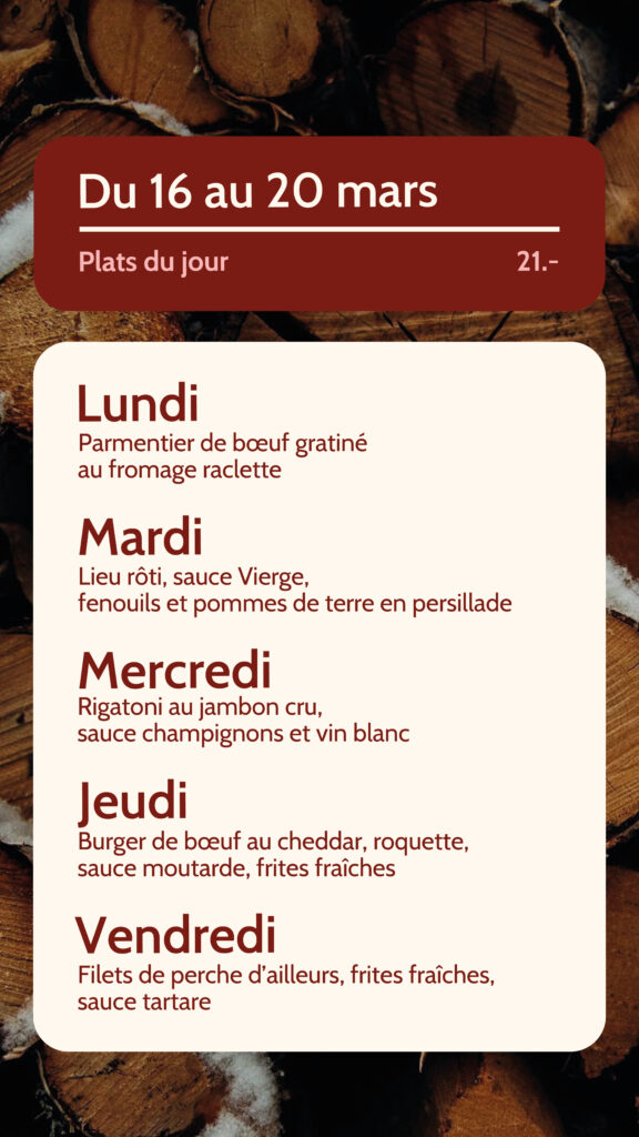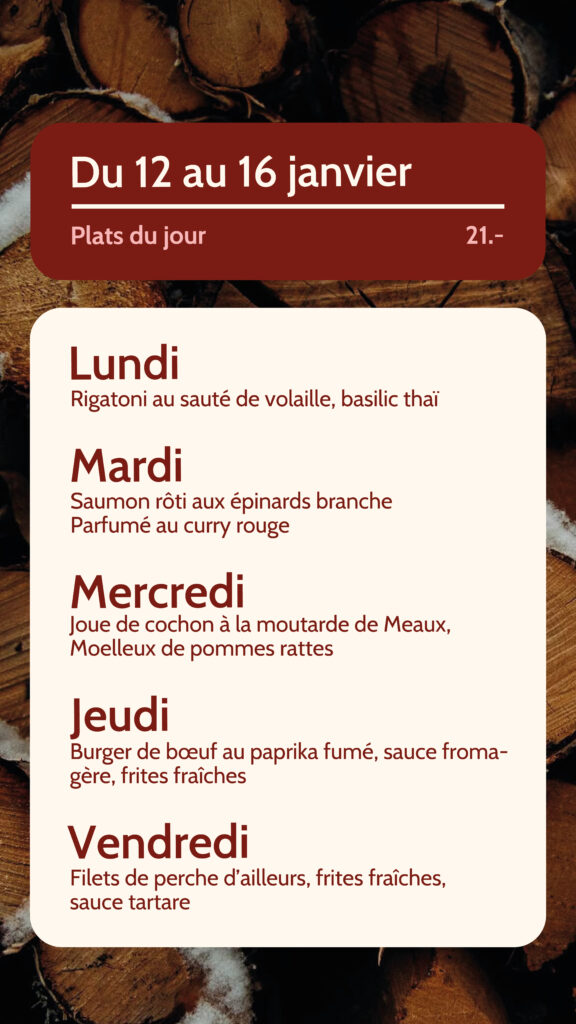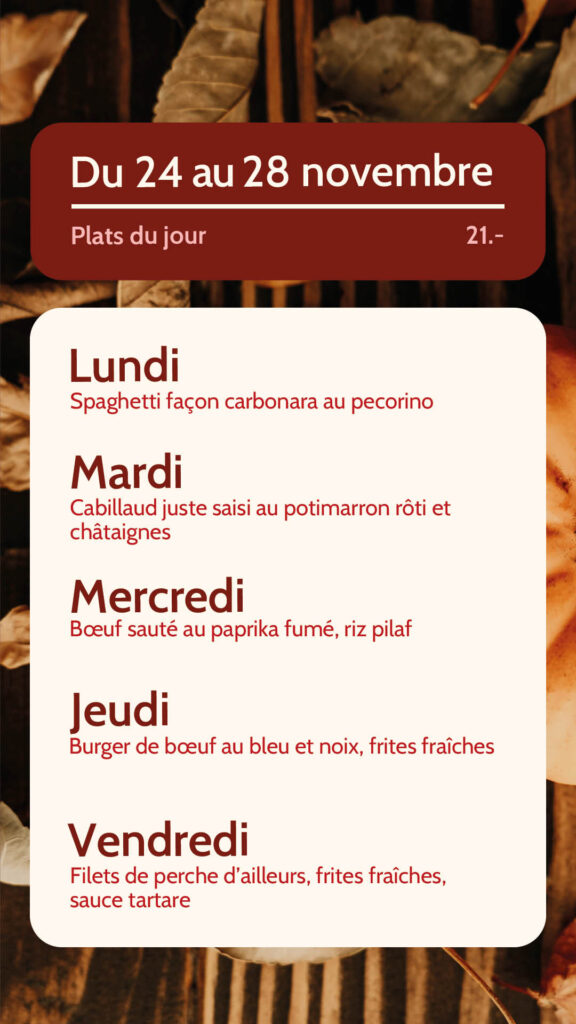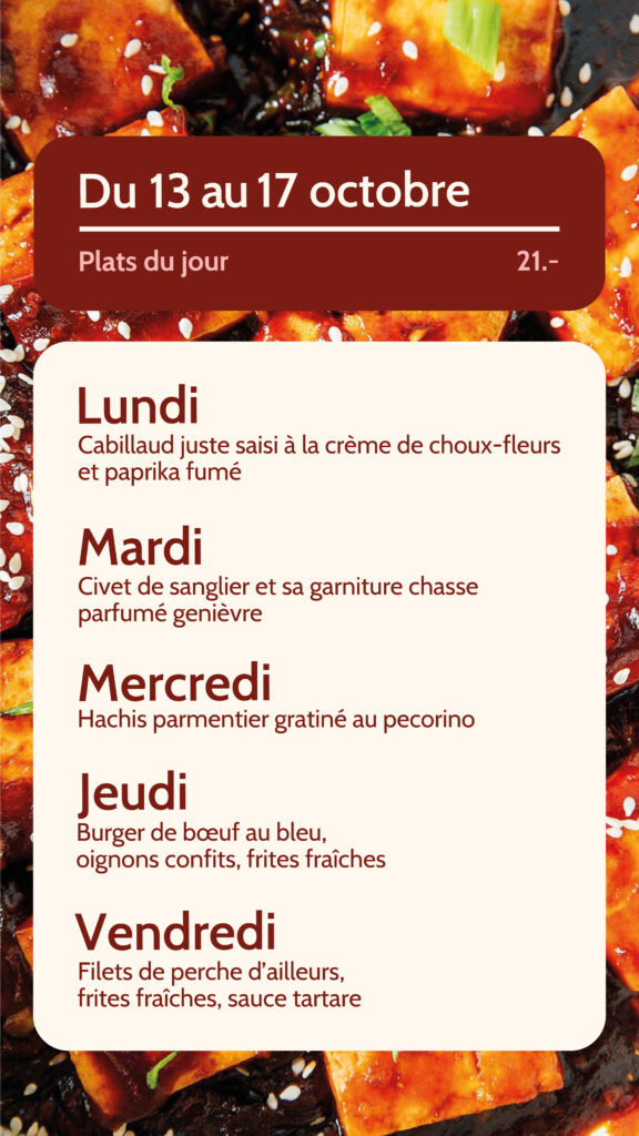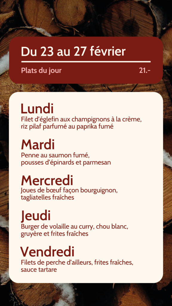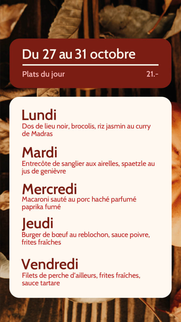 Chaque jour, notre chef présente ses plats à base d’ingrédients frais et de saison. En outre, nous proposons un menu du jour les midis en semaine, pour un déjeuner rapide et savoureux.